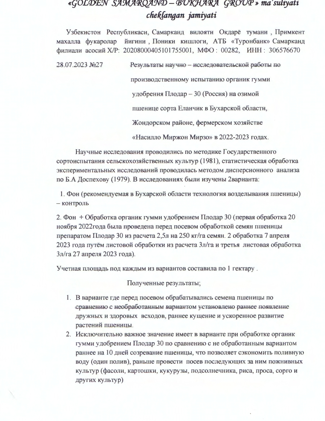 Проведены производственные испытания органического гуминового удобрения PLODAR 30 на озимой пшенице в фермерском хозяйстве.